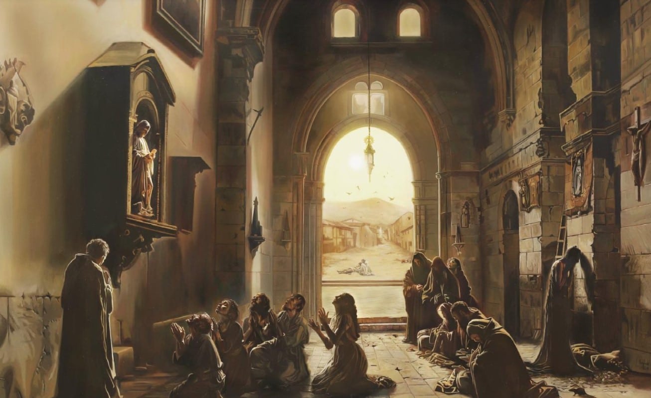 En el cuadro se observa un monje en primer plano, quien parece liderar la plegaria colectiva. La composición incluye también a los Caballeros de Calatrava, quienes en esos tiempos oscuros se encargaban de la asistencia a los afectados y del recuento de las víctimas mortales. La presencia de pájaros carroñeros sobrevolando la escena remarca aún más el ambiente apocalíptico que envolvía al pueblo.