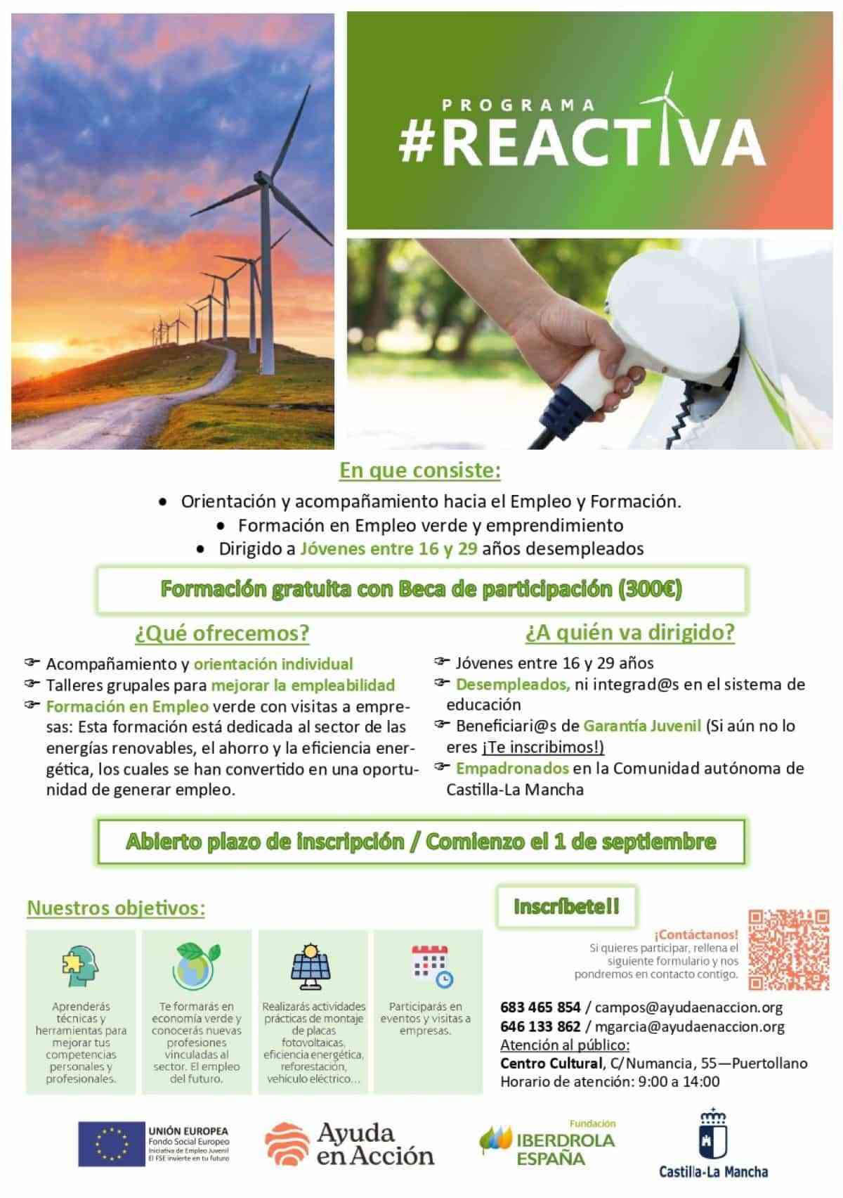 El programa ‘Reactiva’ de la Fundación Iberdrola España y Ayuda en Acción ofrece una beca de participación de 300 euros al objeto de promover la asistencia de jóvenes de 16 a 29 años inscritos en Garantía Juvenil. Se trata de un itinerario formativo por módulos que combina la formación en economía verde con talleres para mejorar la empleabilidad de los participantes, además de una orientación laboral individualizada ajustada al perfil de cada joven.