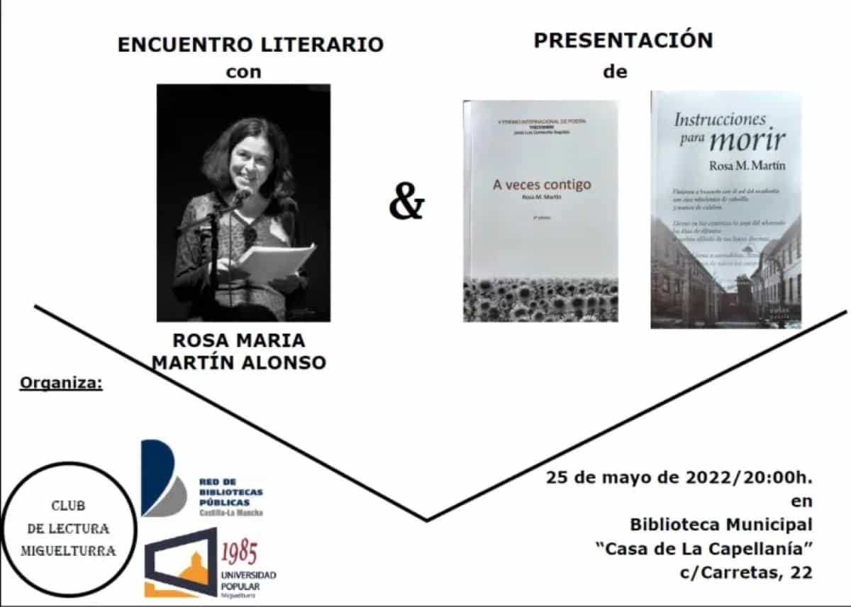 Un encuentro literario con Rosa María Martín Alonso y la presentación de sus dos libros “A veces contigo” e “Instrucciones para morir” tendrá lugar en la  Biblioteca Municipal «Casa de la Capellanía», dependiente del Área de Cultura del ayuntamiento de Miguelturra (Ciudad Real), el miércoles 25 de mayo a las 20:00 horas. El evento es organizado por el Club de Lectura de la Universidad Popular de Miguelturra.