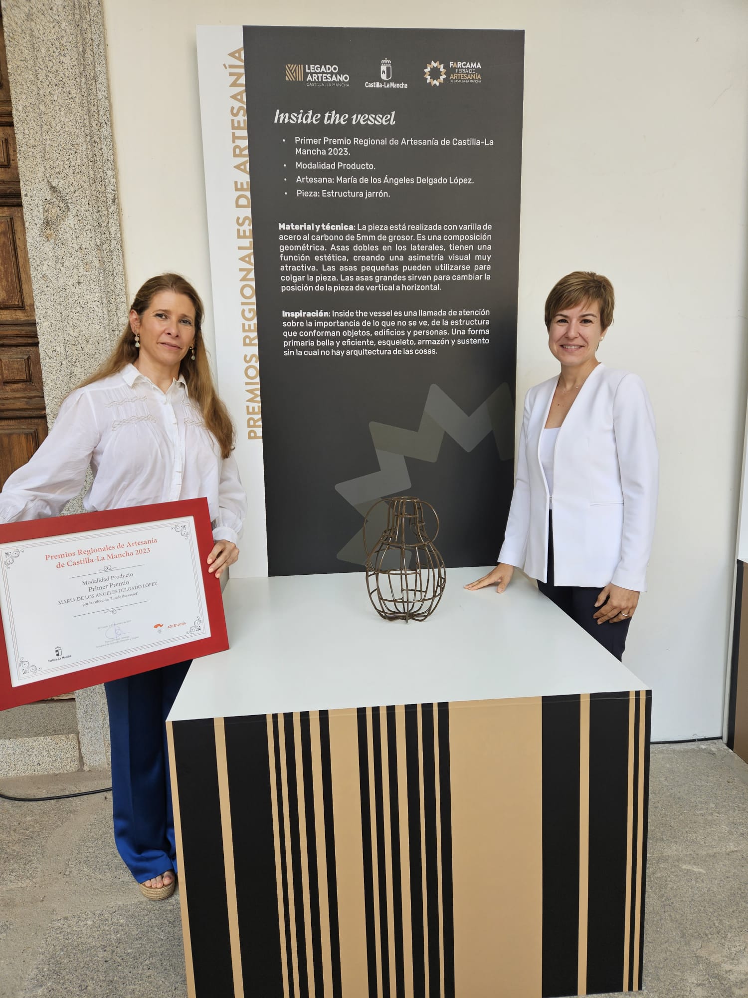 La concejal Inmaculada Amaro felicitó a María de los Angeles Delgado López, de Puertollano, por haber sido galardonada con el Premio Regional de Artesanía en la modalidad de ‘Producto’ durante la entrega de reconocimientos en la XLII edición de Farcama. Delgado es una metalistera que ha destacado por su creatividad e innovación en el arte de la metalistería, diseñando y creando piezas únicas para diversos sectores. Además, trabaja con materiales reciclados y colabora con reconocidos interioristas para crear espacios con personalidad propia. El premio fue otorgado por su valioso aporte al sector artesano, destacando su legado cultural y su capacidad de innovación.