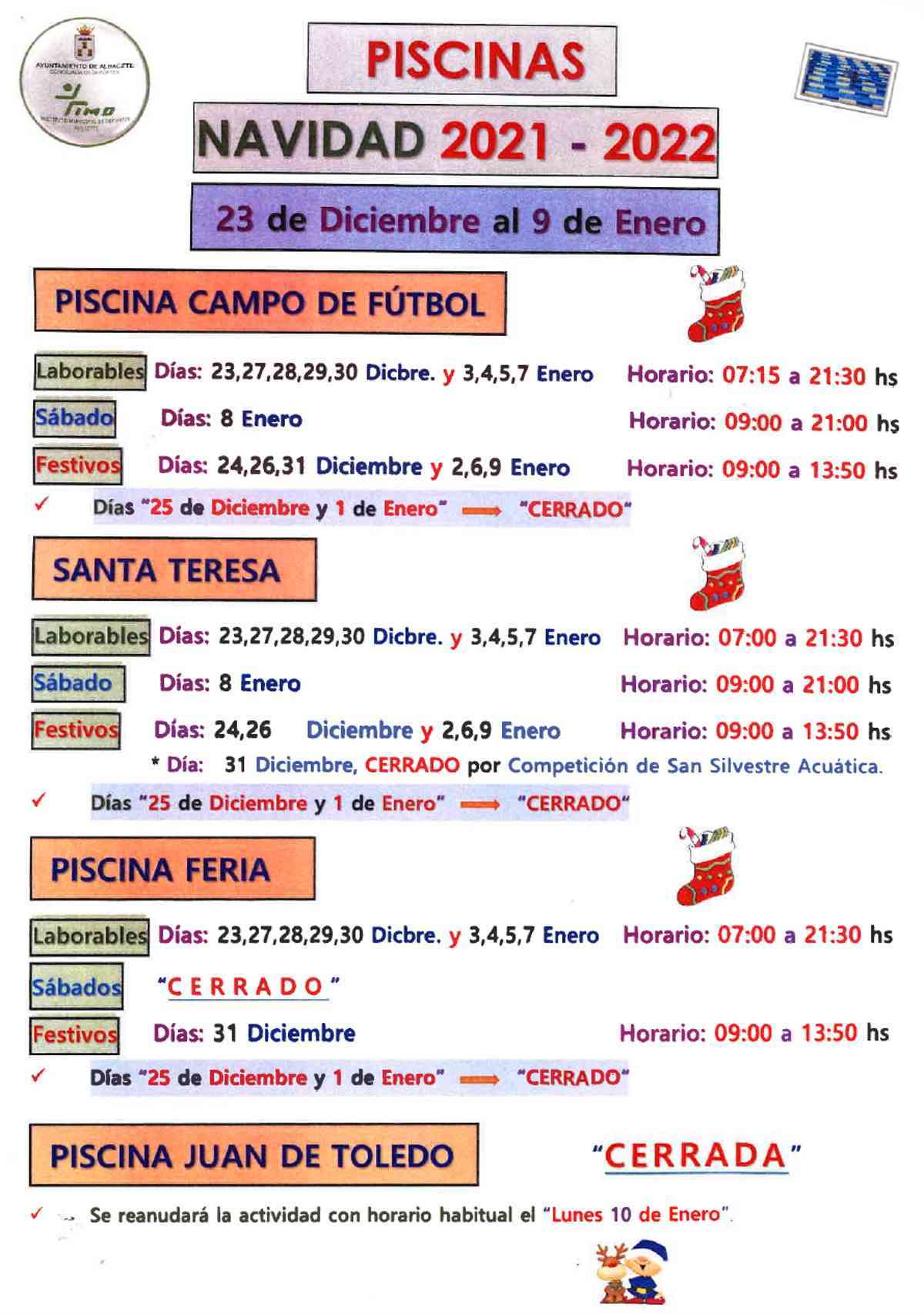 Este horario de las instalaciones incluye las fechas de fin de año y primeros días del próximo enero. En Piscina campo de fútbol, Santa Teresa, Piscina Feria, y Piscina Juan de Toledo.