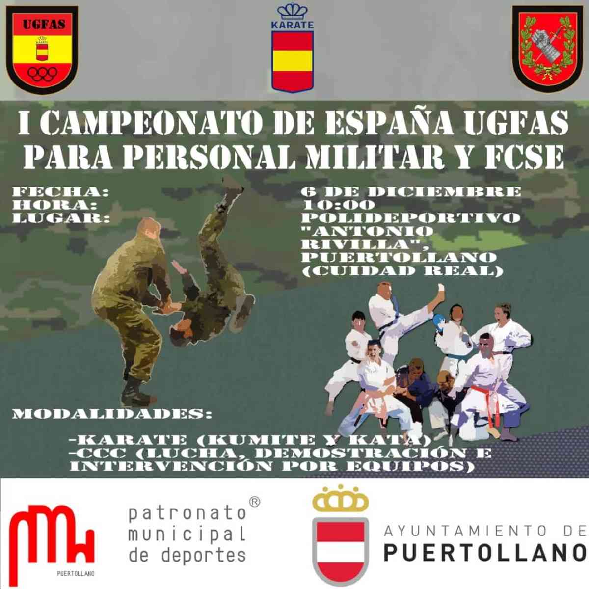El I Campeonato de España UGFAS para personal militar y Fuerzas y Cuerpos de Seguridad del Estado (FCSE) se celebrará el próximo lunes 6 de diciembre. La cita es a partir de las 10 de la mañana en el Polideportivo “Antonio Rivilla” de Puertollano (Ciudad Real). Y el que finalizará a las dos del mediodía.