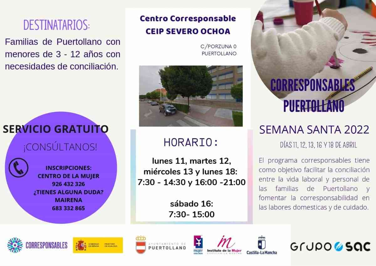 El Plan Corresponsables del Ministerio de Igualdad que lleva a cabo el ayuntamiento de Puertollano (Ciudad Real) a través de su concejalía de Igualdad y del Centro de la Mujer, pone al alcance de padres y madres de la localidad, un recurso para compatibilizar su trabajo con las vacaciones escolares de sus hijos durante Semana Santa.