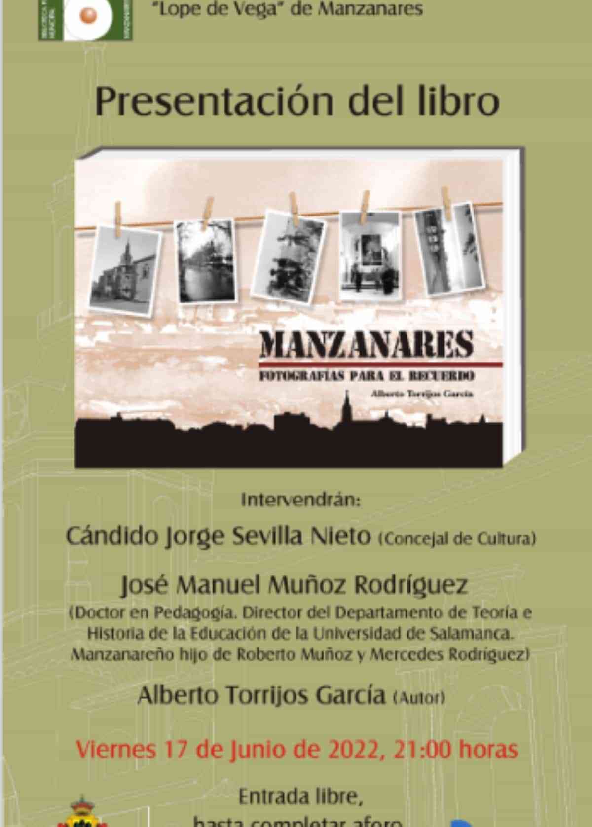 El libro “Manzanares fotografías para el recuerdo” de Alberto Torrijos García, será presentado mañana, 17 de junio. La cita es a las 21 horas en la biblioteca municipal “Lope de Vega” de Manzanares (Ciudad Real).