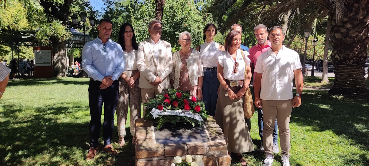 El acto homenaje ha contado con la presencia de representantes del equipo de gobierno y grupos municipales. El primer teniente de alcalde, José Antonio Barba, ha sido el encargado de depositar el centro floral del Ayuntamiento junto al ya tradicional ramo de flores con nueve rosas que Comisiones Obrera pone al pie de la placa, colocado por el secretario provincial de CCOO, José Manuel Muñoz, junto a otros miembros de su organización.