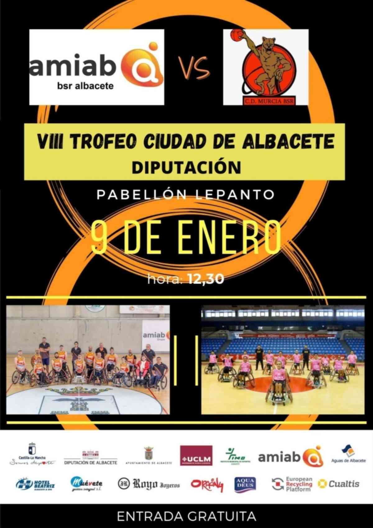 Este domingo 9 de enero se disputará el VIII Trofeo Ciudad de Albacete-Diputación de baloncesto, a partir de las 12:30 horas en el Pabellón de la calle Lepanto de Albacete y con entrada gratuita. De la mano del BSR Amiab y del CD Murcia BS. Un trofeo que vuelve, luego de no celebrarse en los dos últimos años a causa de la pandemia. Y es “un homenaje al baloncesto en silla de ruedas femenino” que acaba de cerrar un año inolvidable en nuestro país.